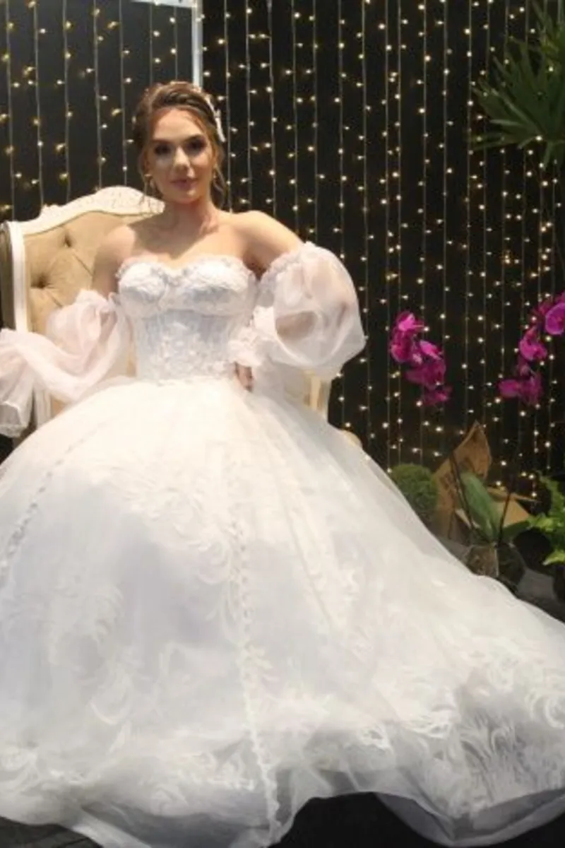 A modelo Manuela Fatica, vestida de noiva, no cenário montado na feira |  Foto: Antonio Moreira/AT