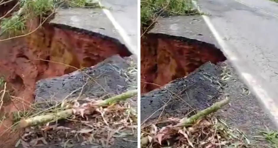Um vídeo mostra que o barranco da lateral da rodovia sofreu um deslizamento, o que está causando o cedimento do asfalto.