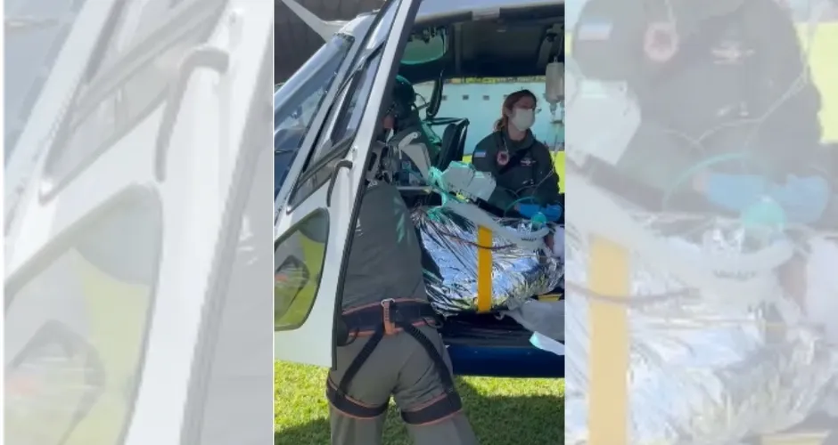 O homem foi socorrido de helicóptero em estado grave, com queimaduras na superfície corporal e nas vias aéreas, necessitando de entubação.