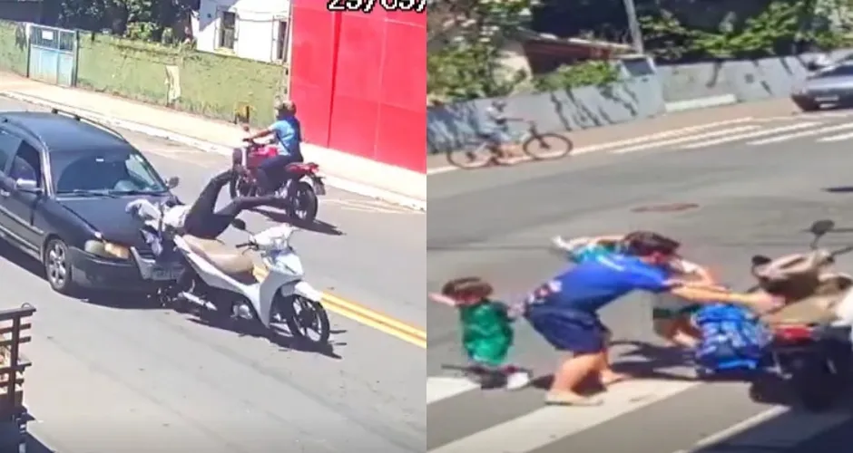 Diante da situação, o professor age com rapidez e consegue segurar a motocicleta antes de ela atingir seus dois filhos. Após o acidente, é possível ver que a motociclista atingida se levanta e vai até a família, aparentando não ter sofrido nenhum ferimento grave.
