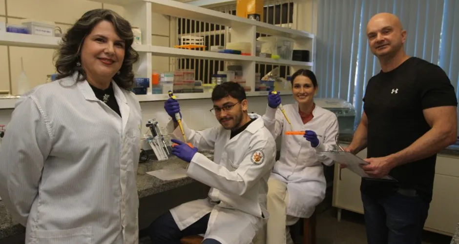 A professora Débora Dummer Meira, vice-coordenadora do projeto “A Genética da Covid Longa”, ao lado do professor coordenador Iúri Drumond e dos alunos Vinicius Ventorim e Livia Morais, explica que o estudo pretende identificar predisposições genéticas relacionadas à persistência de sintomas da doença.