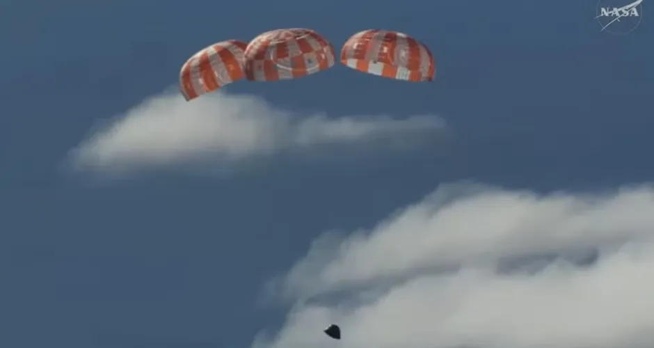 Às 21h03, os paraquedas drogues (responsáveis por dar uma freada e estabilizada inicial na descida) se abriram, seguidos pelos três paraquedas principais, um minuto depois, que conduziram a Orion a um impacto com a água a (não tão) suaves 30 km/h (eis porque um pouso na água é uma boa pedida para amortecer o fim da descida).