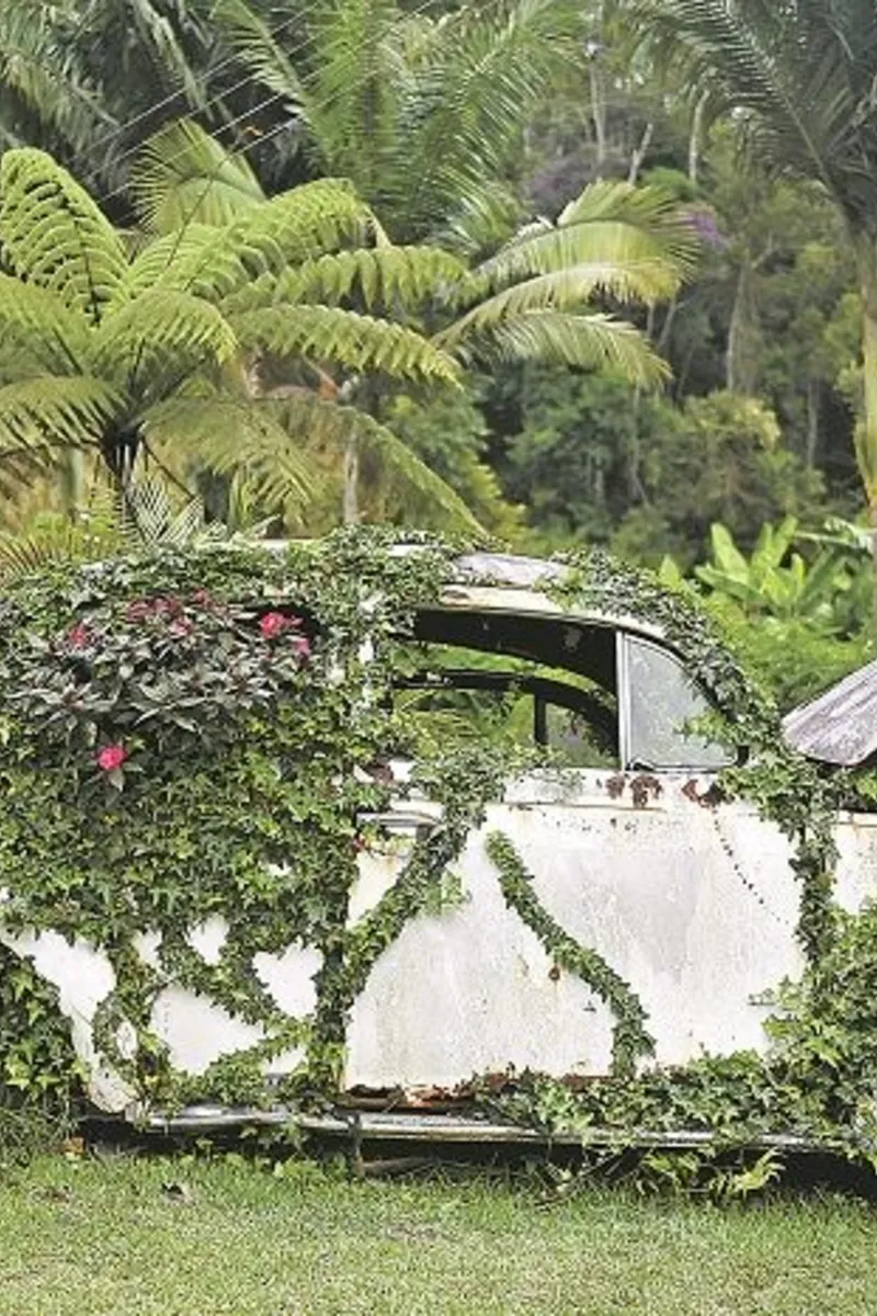 Quem se depara com um Fusca tomado por plantas estacionado na frente de uma propriedade rural no interior de Melgaço, em Domingos Martins, até pensa que se trata de uma obra da natureza. Porém, os ramos podados e as flores coloridas evidenciam que existem mãos humanas por trás dessa criação.
