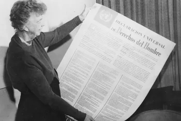 Eleanor Roosevelt exibindo a Declaração Universal dos Direitos Humanos, em 1949 |  Foto: Divulgação