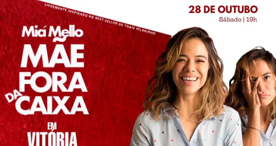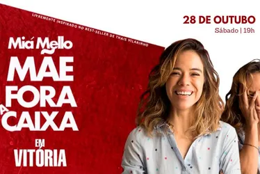 Prêmio: um par de ingressos para a peça de teatro MÃE FORA DA CAIXA, com Miá Mello, no dia 28 de outubro de 2023, no teatro universitário, UFES.