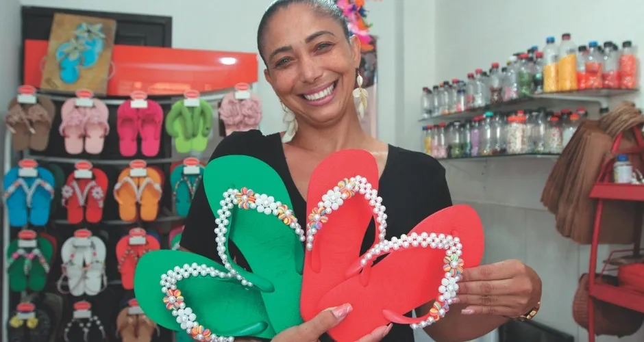 A empreendedora Cristiane Ferrari, de 44 anos, vai expor seus produtos na feira do “As Três Bases”. Ela conta que encontrou na produção de chinelos personalizados uma “terapia” para lidar com o trauma ter sido vítima de uma tentativa de feminicídio “Chego a faturar entre R$ 7 mil a R$ 10 mil na alta temporada, no verão”, conta.