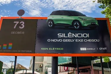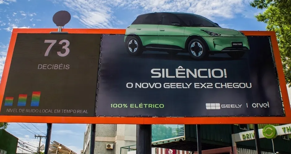 A Avenida Dante Michelini, na Praia de Camburi, em Vitória (ES), ganhou um outdoor que mede, em tempo real, o nível de ruído do trânsito local — que pode ultrapassar 100 decibéis nos horários de pico. Criada pela agência Prósper, a ação marca a chegada da Orvel Geely ao Espírito Santo e apresenta o EX2, carro elétrico mais vendido da China, com a mensagem direta: “Silêncio! O novo Geely EX2 chegou.”
