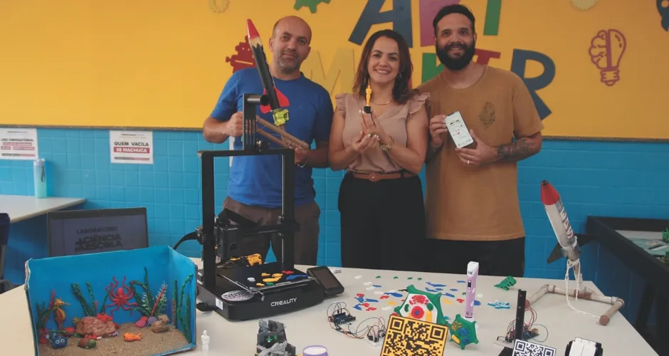Eles revelaram que o projeto “Iniciação Maker: a utilização de ferramentas e tecnologias maker para o resgate histórico sociocultural da comunidade de Tabuazeiro” surgiu a partir da implantação da sala maker. Ao lado da diretora Eliane Amorim, Zacarias disse que a proposta aproveita o espaço para integrar o currículo a vivências da comunidade.