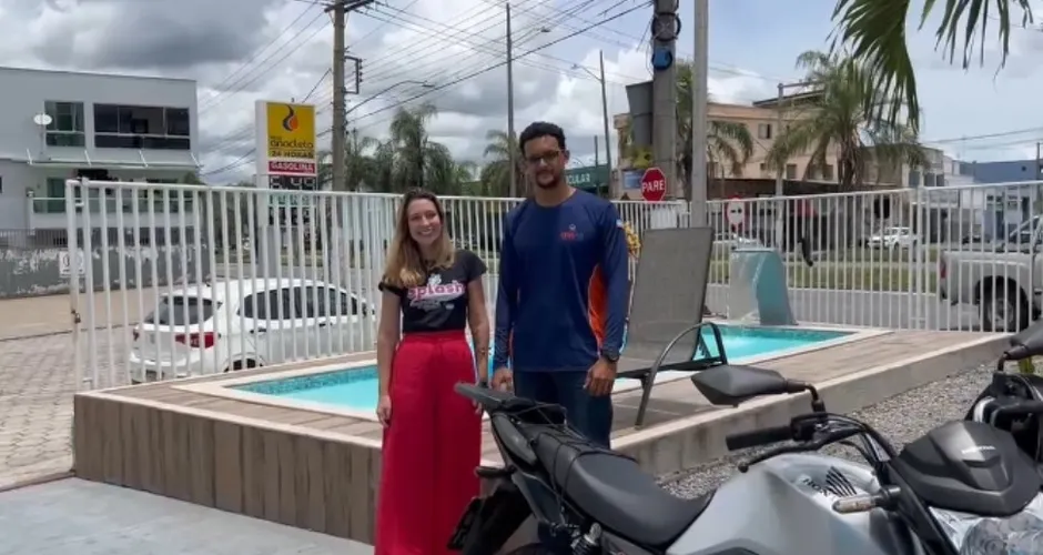 VÍDEO | Homem desce de moto e mergulha de capacete em piscina de loja no ES