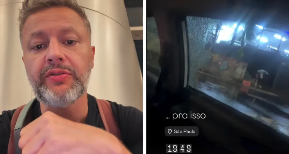 "Eu dei sorte porque vi o vulto chegando e vi ele pegando o embalo para dar a porrada. Aí, eu segurei o celular firme. Ele puxou da minha mão, mas não conseguiu pegar. Só que voou vidro por tudo, mão e coisa e tal", afirmou o músico. No Instagram, o artista compartilhou fotos do vidro quebrado do carro.