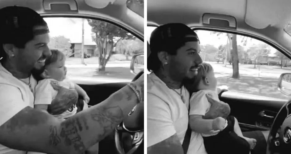 Em vídeo viralizado, ele aparece sorrindo, com o bebê no banco da frente
