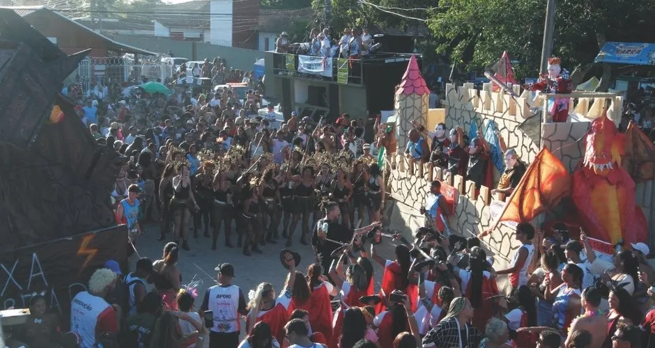 Momento da encenação da disputa entre Medusas e guerreiras, com direito a carros alegóricos |  Foto: Leone Iglesias/AT