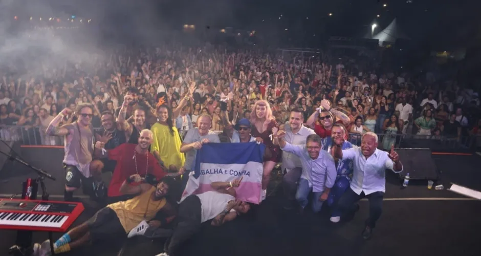 Governador Renato Casagrande entre artistas que se apresentaram na primeira noite da temporada de abertura do complexo de entretenimento |  Foto: Hélio Filho/Secom-ES