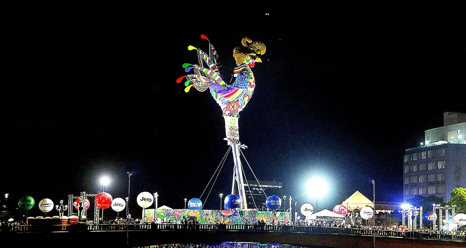 Extamente às 18h42 desta quarta-feira (26), o prefeito João Campos fez a contagem regressiva e deu a ordem para que a estrutura de 8 toneladas e 32 metros fosse erguida em meio a uma chuva de confetes e muito frevo, para o delírio de centenas de foliões, que fizeram questão de ver de perto o majestoso galo, colorido com as cores da bandeira de Pernambuco.