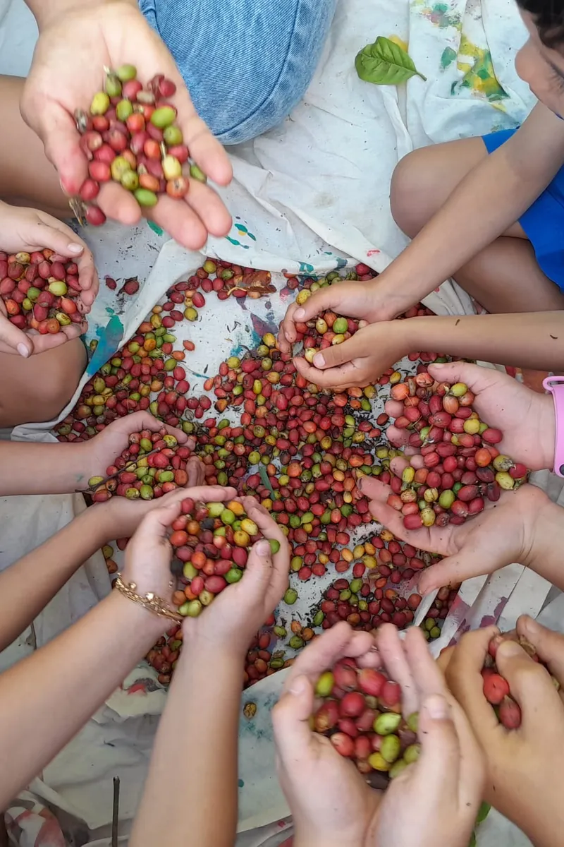 CRIANÇAS SEGURAM GRÃOS DE CAFÉ: projeto também desenvolve hábitos alimentares mais saudáveis |  Foto: Conteúdo Especial