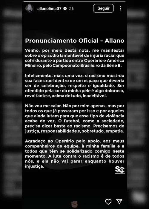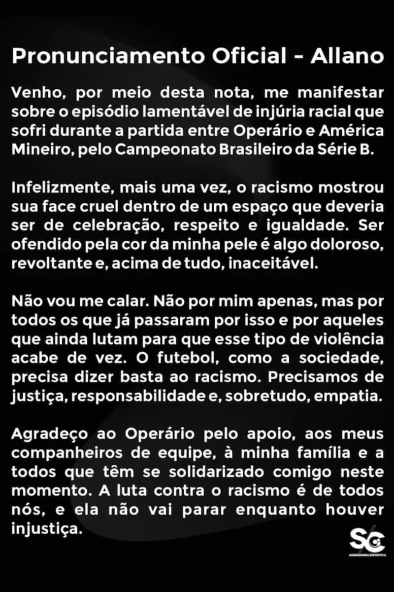 O atacante Allano, alvo de injúria racial durante partida do seu time, o Operário-PR, contra o América-MG, neste domingo, se manifestou por meio das redes sociais sobre o episódio. O jogador quebrou o silêncio e cobrou rigor das autoridades para que o autor do ato discriminatório seja punido.