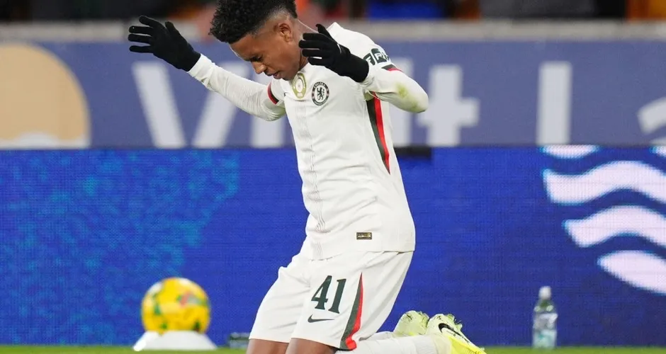 O brasileiro Estêvão, do Chelsea, comemora após marcar gol na partida contra o Wolverhampton Wanderers válida pela quarta fase da Copa da Liga Inglesa, realizada no Estádio Molineux, em Wolverhampton, na Inglaterra, nesta quarta-feira, 29 |  Foto: JACOB KING/PA/ASSOCIATED PRESS/ESTADÃO CONTEÚDO