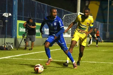 Vinícius, atacante do Vitória, é marcado de perto por Lucas Dedé, zagueiro do Forte. Times empataram em 1 a 1 pela partida de ida das quartas de final
