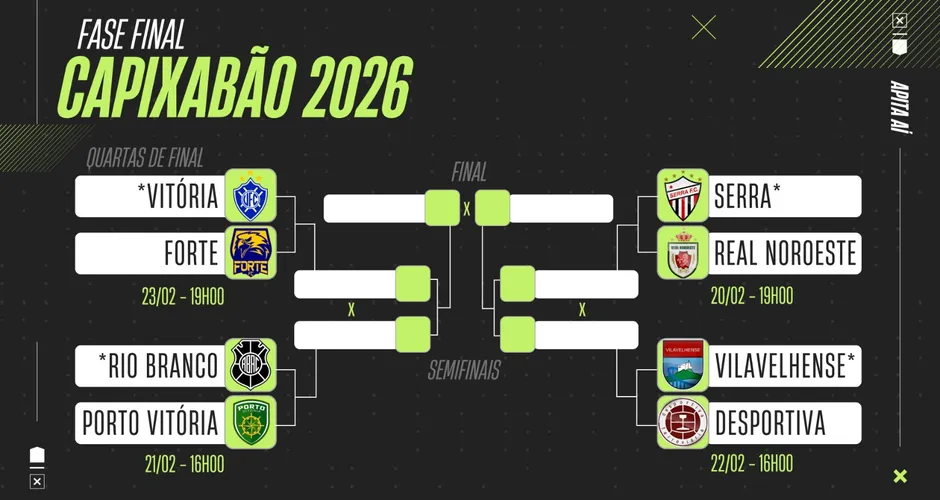 Do outro lado da chave teremos a reedição da final de 2025. Porto Vitória x Rio Branco jogam no sábado (21) às 16h no Kleber Andrade, em Cariacica. Fechando os jogos de ida das quartas de final, Forte x Vitória jogam na segunda-feira (23) às 19h, no estádio Almiro Ofranti, em Vargem Alta.