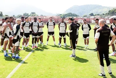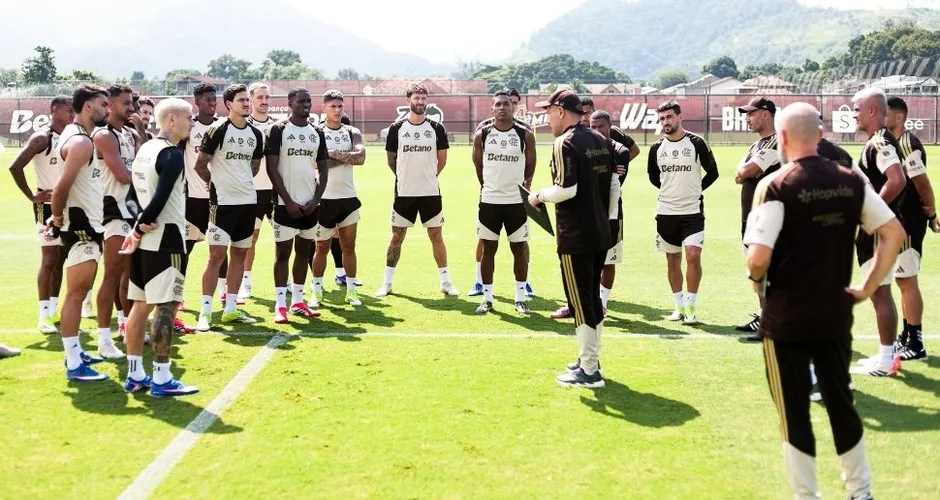 Leo Jardim conversa com os jogadores do Flamengo durante o treino antes do jogo de hoje à noite