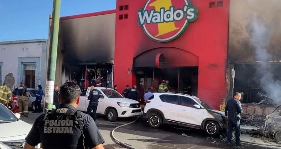 Imagens que circulam nas redes sociais mostram um incêndio de grandes proporções tomando a loja Waldo's. Um vídeo mostra um homem com queimaduras desabando no asfalto a poucos metros da entrada da loja.