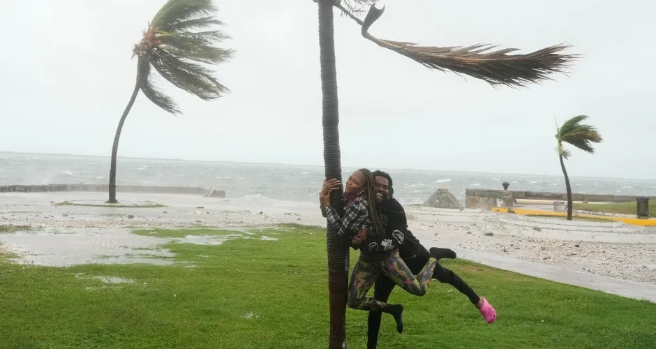 Casal brinca com a força dos ventos na orla de Kingston, na Jamaica, nesta terça-feira (28), enquanto o Furacão Melissa se aproxima do país. De categoria 5, o furacão atingiu a Jamaica com ventos catastróficos e potencial para inundações e deslizamentos de terra generalizados. |  Foto: MATIAS DELACROIX/ASSOCIATED PRESS/ESTADÃO CONTEÚDO