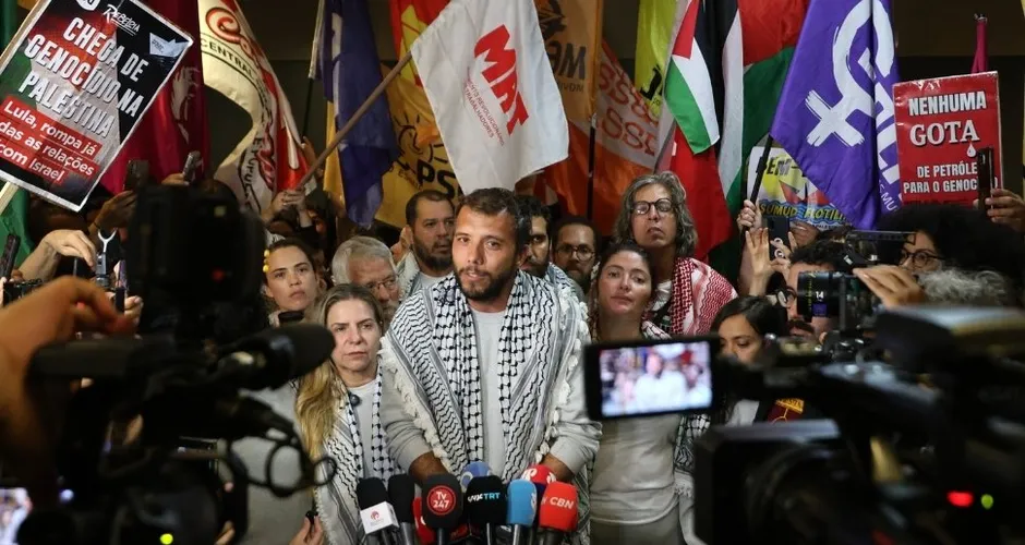 Os 13 brasileiros detidos por Israel após a interceptação da flotilha Global Sumud, que levava ajuda humanitária à Faixa de Gaza, foram deportados e chegam ao Brasil, na manhã desta quinta-feira, 9 de outubro de 2025. Entre os deportados estão a deputada federal Luizianne Lins (PT-CE)(c/e) e o ativista Thiago Ávila (c/d), que falaram à imprensa no saguão do Aeroporto Internacional de Guarulhos