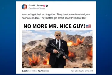 O presidente dos Estados Unidos, Donald Trump, voltou a ameaçar o Irã nesta quarta-feira (29), em meio ao impasse das negociações pelo fim do conflito no Oriente Médio. O republicano publicou uma imagem gerada por Inteligência Artificial em que aparece segurando uma arma, com explosões ao fundo, e a mensagem: "Chega de ser bonzinho".