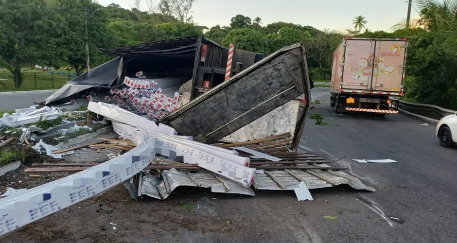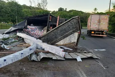 Um acidente envolvendo um caminhão carregado de PVC comprometeu o fluxo de veículos no quilômetro 51 da BR-101, em Paulista, no Grande Recife. O tombamento ocorreu por volta das 4h15 desta sexta-feira (17), sobre o viaduto localizado ao lado do Hospital Miguel Arraes (HMA).