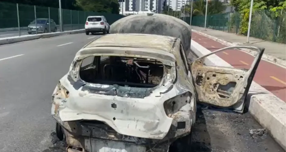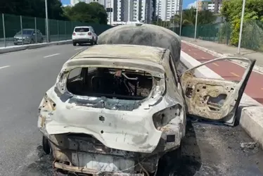 Um carro ficou completamente destruído após pegar fogo na manhã deste sábado (26), na Via Mangue, Zona Sul do Recife. O caso aconteceu por volta das 11h40, no sentido Pina/Centro.