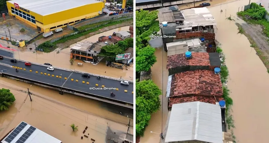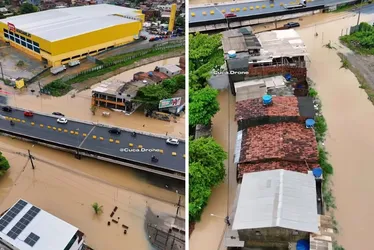 No entorno do Canal do Fragoso, o cenário era de desespero. Imagens aéreas revelam residências invadidas pela água barrenta. A obra de urbanização da bacia ainda não foi capaz de conter o avanço das águas em dias de precipitação intensa.