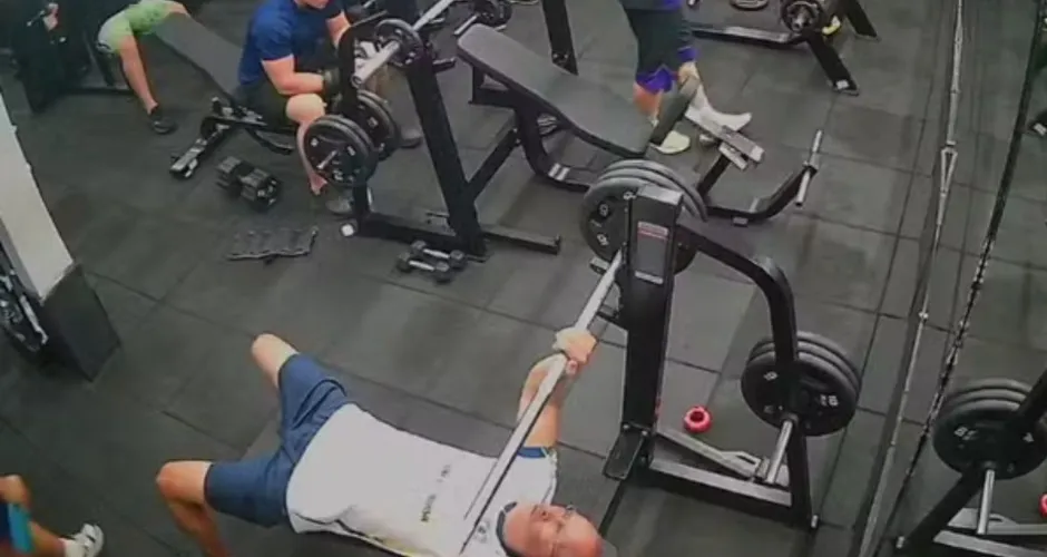 Imagens de câmera de segurança mostram o momento em que a barra escapa das mãos dele, acerta o peito e o derruba segundos depois.