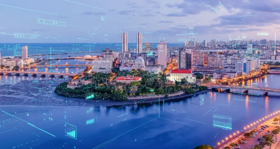 Recife, como "capital da tecnologia" do Nordeste, é o laboratório perfeito para testar se esse "futuro que começa de verdade" será inclusivo ou apenas tecnológico |  Foto: Imagem divulgação do Recife com inclusão de elementos IA