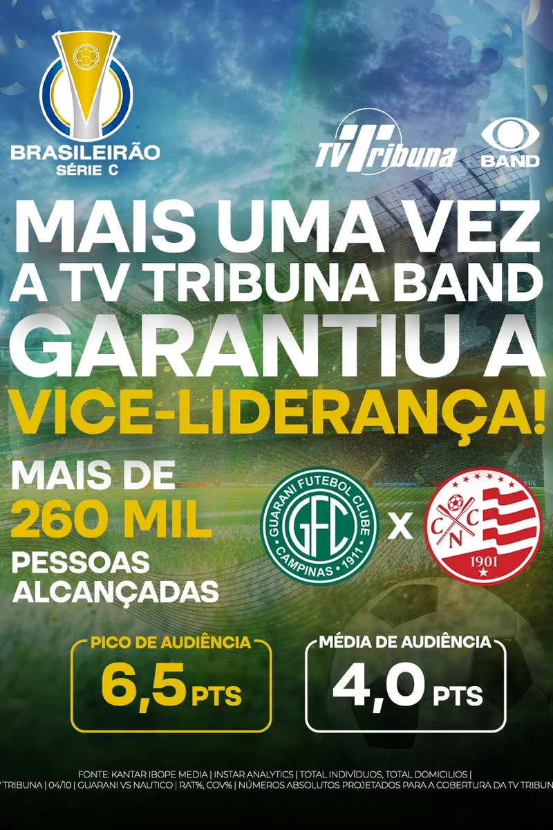 A TV Tribuna/Band alcançou a vice-liderança absoluta com a transmissão do embate entre Guarani e Náutico, no último sábado, pelo Campeonato Brasileiro Série C. De acordo com dados do Ibope, a transmissão atingiu média de 4,0 pontos, com pico de 6,5 pontos, alcançando mais de duzentas e sessenta mil pessoas.