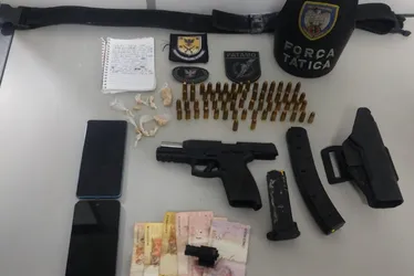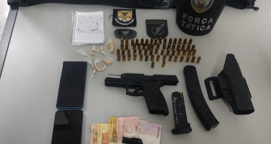 De acordo com a Guarda Municipal, foram apreendidos uma pistola calibre .9mm G2C; 62 munições calibre .9mm; um carregador com capacidade para 16 munições; um carregador com capacidade para 30 munições; uma mira laser; um coldre; um cinto tático; além de 13 pedras de crack; dois aparelhos celulares; um caderno de anotações e R$ 115,00 em espécie.