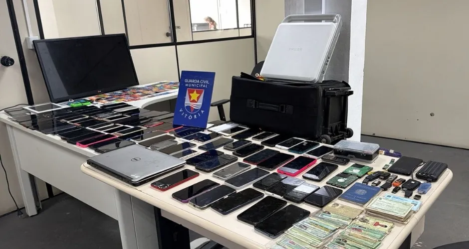 Com a dupla, ainda foram encontrados mais de 93 celulares, 32 documentos, 130 cartões de crédito, um computador, uma TV e um notebook |  Foto: Divulgação/Guarda de Vitória