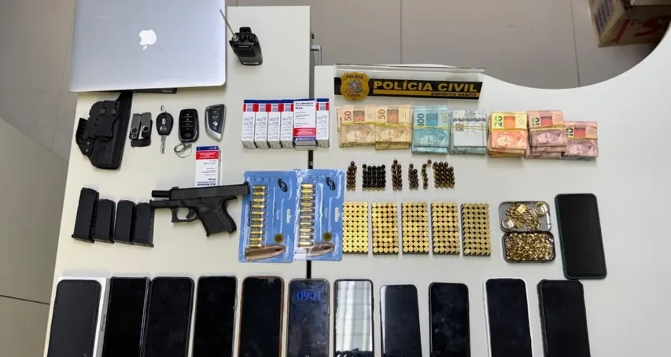 Foram apreendidos mais de R$ R$ 40.000 em espécie, três armas de fogo com diversas munições, sete veículos e aparelhos eletrônicos |  Foto: Divulgação/PCES