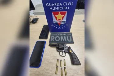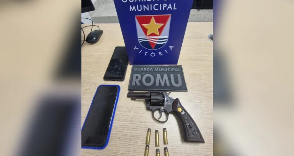 Arma, munição e celulares que foram apreendidos |  Foto: Divulgação/Guarda de Vitória