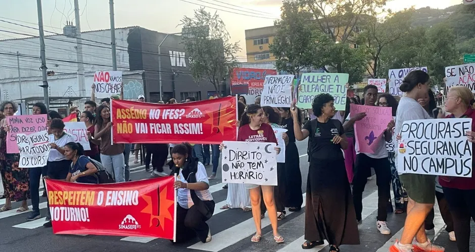 Durante o protesto, os alunos fecharam duas faixas da Avenida Vitória no sentido Centro. Eles seguravam cartazes com os dizeres 'Procura-se segurança no campus', 'Não vamos nos calar' e 'Mulher a culpa que tu carrega não é tua'.