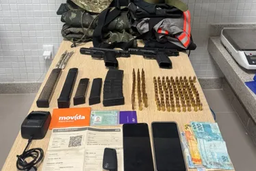 Dentro do veículo foram encontradas duas pistolas calibre 9mm com seletor de rajadas, três buchas de maconha, 29 munições de fuzil calibre 5.56mm, 91 munições calibre 9mm, roupas camufladas e uma balaclava.
