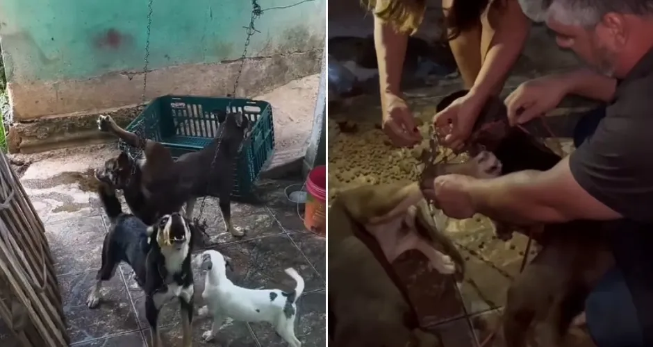 Nove cachorros foram encontrados em situação de maus-tratos dentro de uma residência no bairro Castelo Branco, em Cariacica, na tarde dessa quarta-feira (8). Durante a ação, um dos animais foi localizado pendurado de cabeça para baixo, preso por uma corrente e um cadeado. Um homem, apontado como suspeito do crime, foi identificado e levado para a delegacia.