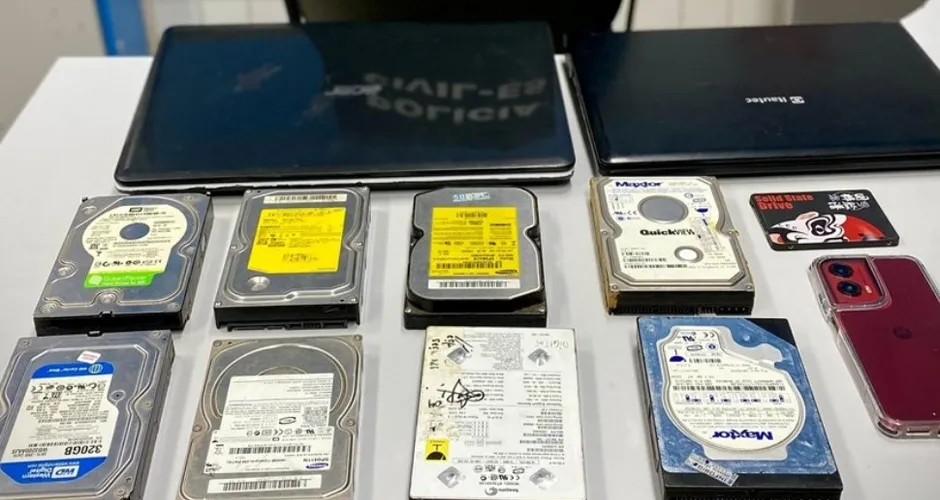 No local foram apreendidos diversos aparelhos eletrônicos, como computadores, HDs e um celular de uso do suspeito