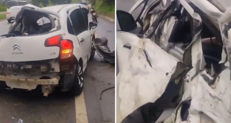 O carro em que o casal estava ficou totalmente danificado |  Foto: Reprodução/Redes Sociais