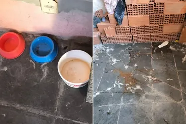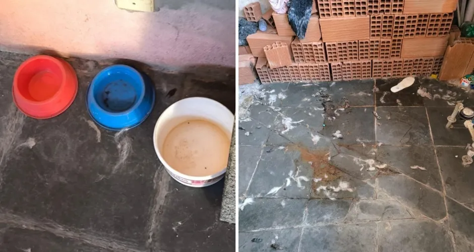 Animal estava extremamente magro e vivendo em um ambiente sujo, com fezes e pelos espalhados pelo chão, e sem indício de alimentação adequada