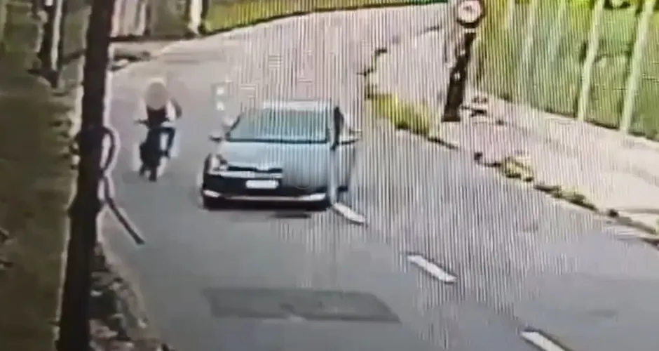 As imagens mostram que a mulher segue na via, quando um carro se aproxima em alta velocidade e cerca a vítima. Um homem desce do carro e aborda a mulher, a obrigando a descer da bicicleta elétrica. Após o assalto, um dos suspeito sai do local com o carro, sendo seguido pelo comparsa que pilota a bicicleta.