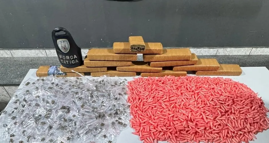 Ao todo, foram apreendidos 13 tabletes de maconha, pesando aproximadamente 7,9 kg, além de 553 buchas de maconha, 2.080 pinos de cocaína e uma balança de precisão.
