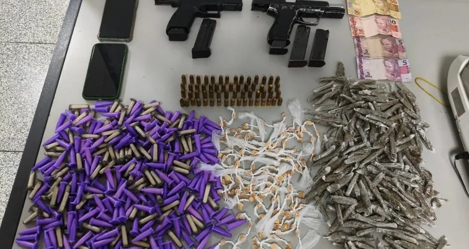 Foram apreendidos duas pistolas, cinco carregadores, 59 munições, 311 pinos de cocaína, 198 buchas de maconha, 140 pedras de crack, dois celulares e R$ 70 em espécie. Os envolvidos foram encaminhados à autoridade policial.