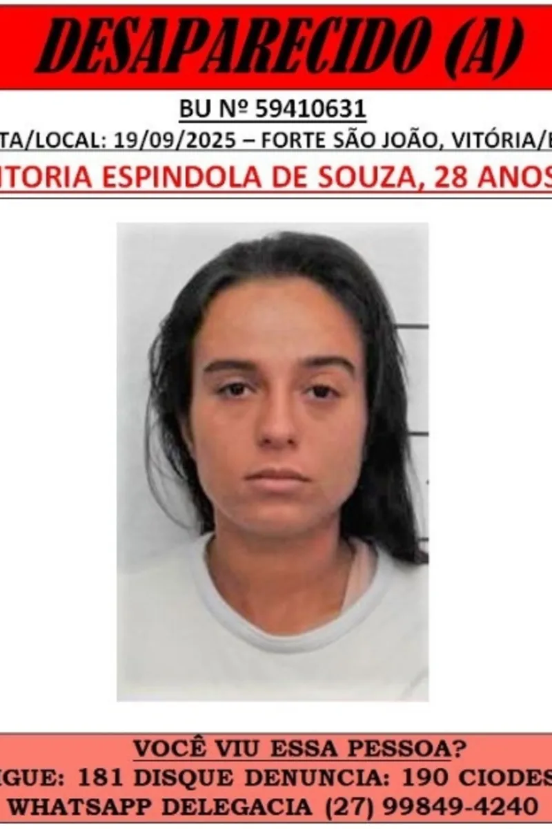 A Polícia Civil está investigando o desaparecimento da jovem Vitória Espindola de Souza, de 28 anos. A foto dela foi divulgada nesta quinta-feira (13) e a Delegacia Especializada de Pessoas Desaparecidas pede ajuda da população que possa compartilhar informações sobre sua localização.