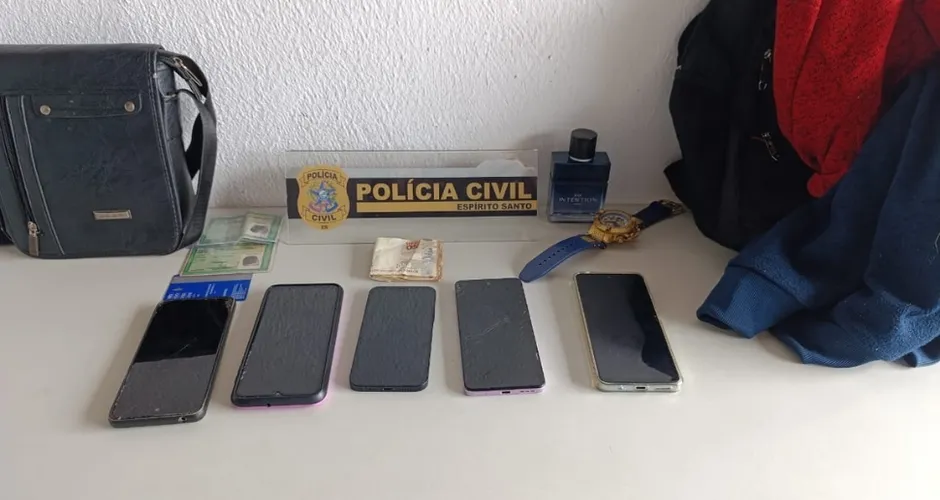 Com o suspeito, foram apreendidos cinco aparelhos furtados, documentos, cartões bancários e R$ 500,00 em dinheiro |  Foto: Divulgação