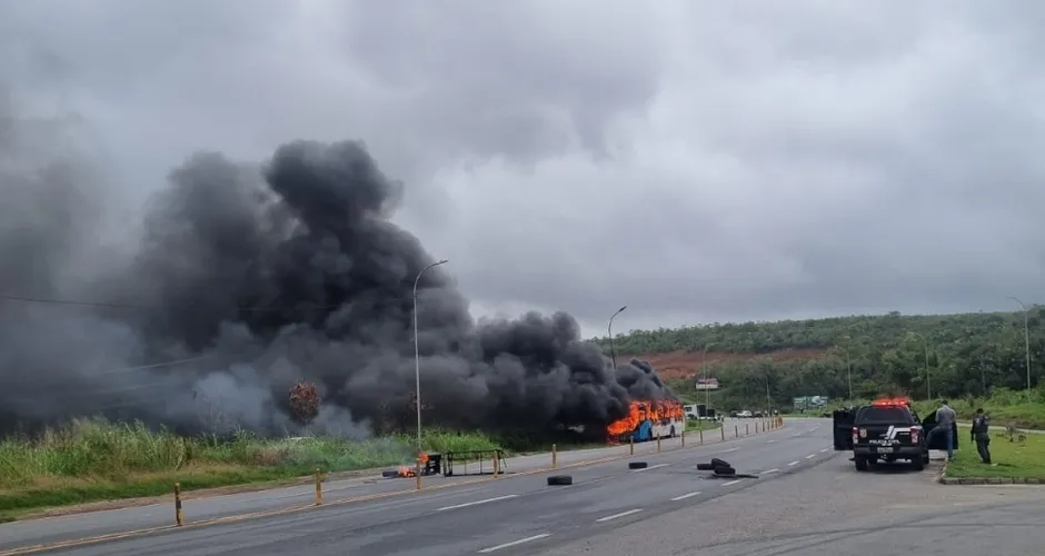 Coletivo foi incendiado e apedrejado por suspeitos na BR-101, na entrada do bairro Cidade Pomar, na Serra